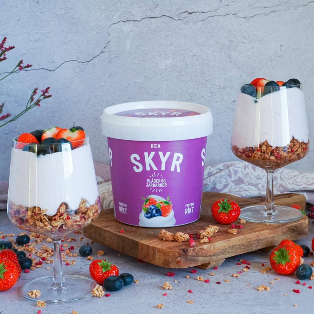 KEA skyr með bláberjum og jarðarberjum hefur verið í miklu uppáhaldi hjá landsmönnum um árabil enda með eindæmum bragðgott og próteinríkt skyr. Sífellt fleiri kjósa stærri umbúðir fyrir bæði heimili og vinnustaði og er gaman að segja frá því að nú getum við loksins boðið upp á þetta ljúffenga skyr í 1 kg fötu.