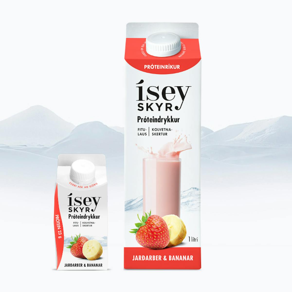 Ísey skyr hefur svarað óskum fjölmargra neytenda og býður nú upp á Ísey skyr próteindrykk með jarðarberjum og bönunum í 1l fernu á hagstæðu verði. Skyrdrykkinn er gott að eiga í ísskápnum heima og hella í glös til að njóta og fylla á tankinn eftir skóla, vinnu og íþróttaæfingar. Við bindum miklar vonir við að neytendur taki þessari nýjung vel og hver veit nema fleiri bragðtegundir fylgi í kjölfarið.