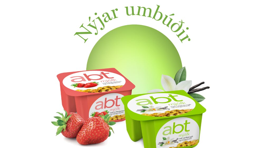 Abt-mjólkin er nú komin í nýjar tveggja hólfa litaðar umbúðir en við kveðjum hvítu dósirnar og skiptum yfir í litríkar og fallegar dósir. Abt-mjólk með vanillubragði og morgunkorni fer í græna dós og er komin í verslanir og á næstu misserum fer abt-mjólk með jarðarberjum og morgunkorni yfir í bleika dós. Með þessum breytingum viljum við styrkja enn frekar tenginguna við ab-mjólk þar sem vörurnar innihalda sömu heilnæmu a- og b-gerla sem treysta mótstöðuafl líkamans í meltingarvegi og gera þannig óæskilegum gerlum erfitt uppdráttar.
