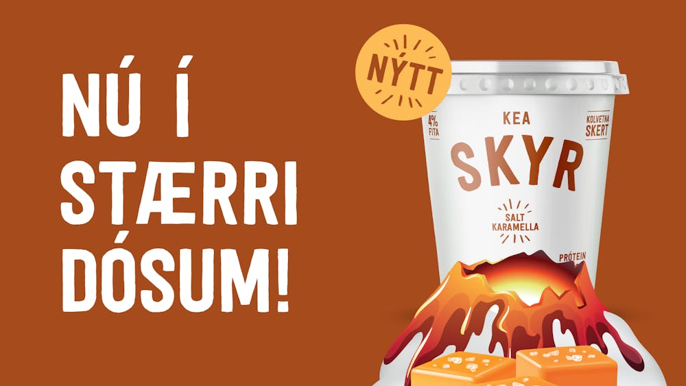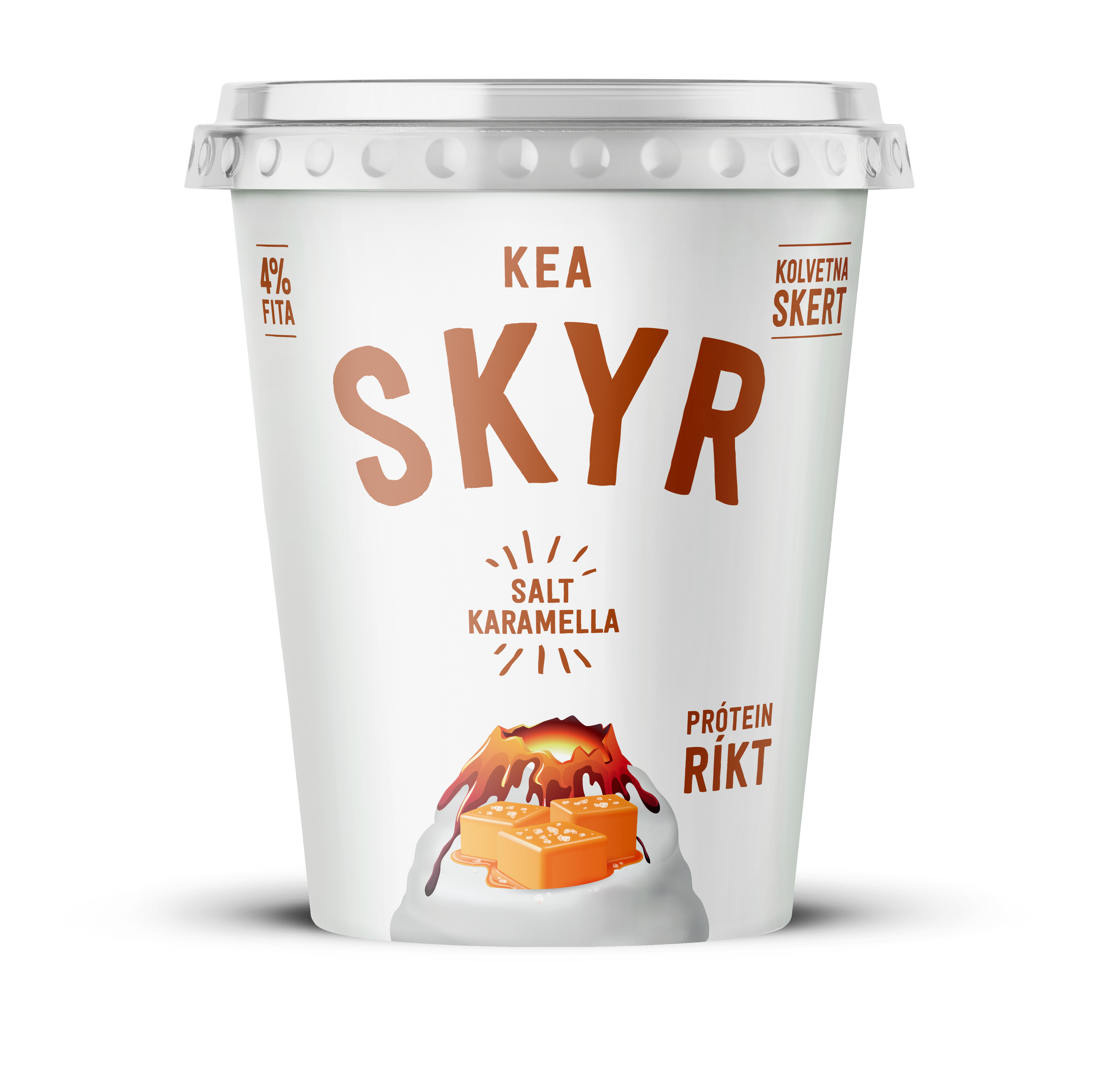 Það vakti mikla athygli þegar sérstök eldgosaútgáfa af KEA skyri var sett á markað fyrir tveimur árum síðan en bragðgott saltkaramelluskyrið hitti beint í mark hjá skyrunnendum landsins. Fyrirspurnum rigndi yfir okkur þar sem óskað var eftir skyrinu góða í stærri umbúðum og hefur kallinu nú loksins verið svarað og gaman að segja frá því að KEA skyr með saltkaramellu fæst nú í 500 g dósum. Umbúðirnar sóttu innblástur í eldgosið í Geldingadölum þar sem skyrfjall spúandi eldi og karamellu prýddi dósina en þegar gosinu lauk stóð girnilegt skyrfjallið eftir. Upphaflega stóð til að skyrið yrði aðeins á markaði í stuttan tíma en viðtökurnar fóru langt fram úr væntingum og því er svo komið að í dag hafa neytendur val um 200 og 500 g dósir af þessu bragðgóða, laktósalausa og próteinríka eldgosaskyri.