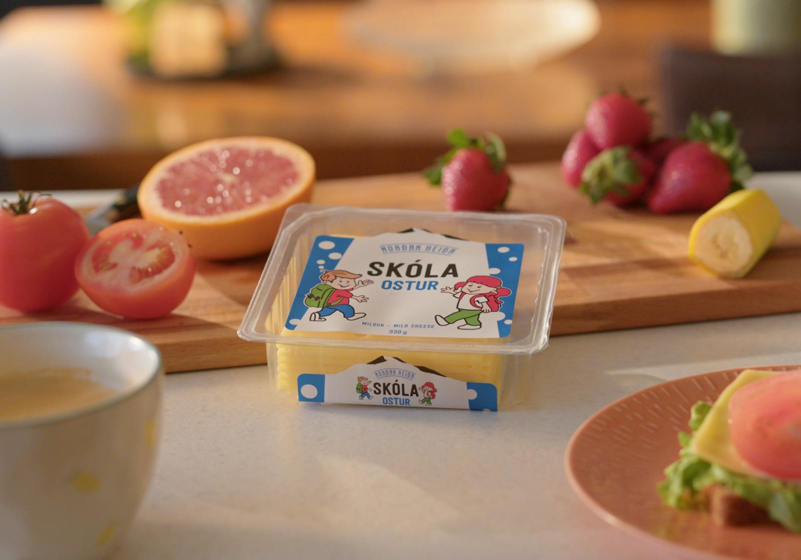 Skólaostur er mildasti osturinn í Norðan heiða vörulínunni en ostinn er ýmist hægt að setja ofan á brauð eða skera niður í stangir eða litla bita. Hér er á ferðinni góður prótein- og kalkgjafi sem smellpassar í nestisboxið.